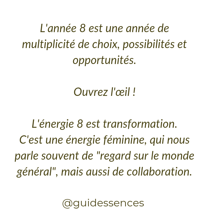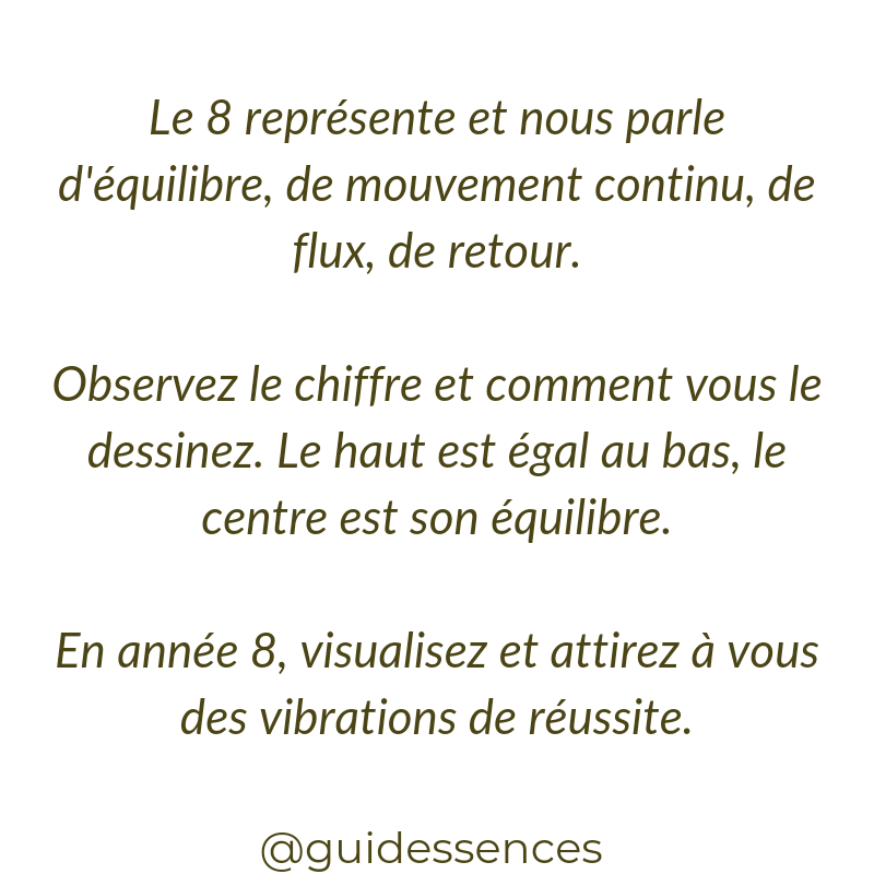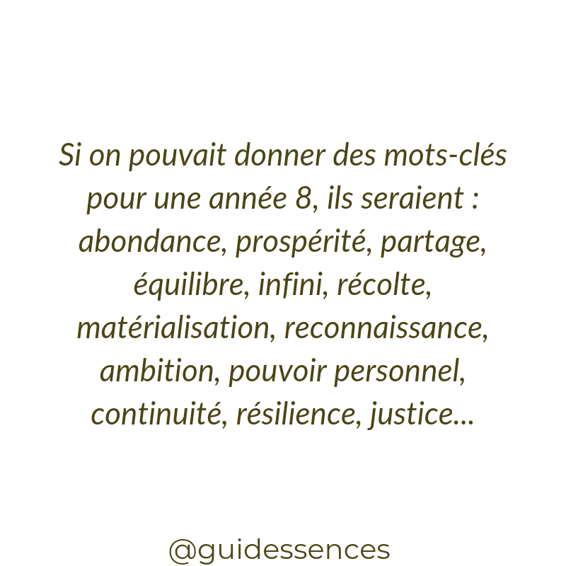 Une année pleine de potentiel et de promesses. A toi d’en tirer profit et de garder l’œil ouvert sur les occasions qui se présentent (ce qui ne veut pas dire que tu dois dire « oui » a tout!). Reste aligné. Écoute ton cœur (ton centre) et fais ce qui te nourris. Si tu souhaites manifester tout ce que l’année 8 peut t’apporter réponds « oui » dans les commentaires et n’hésite pas à partager le post !